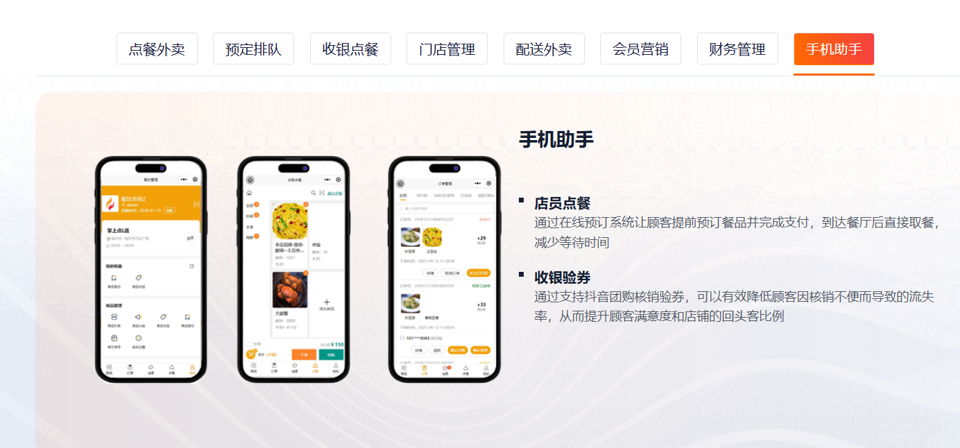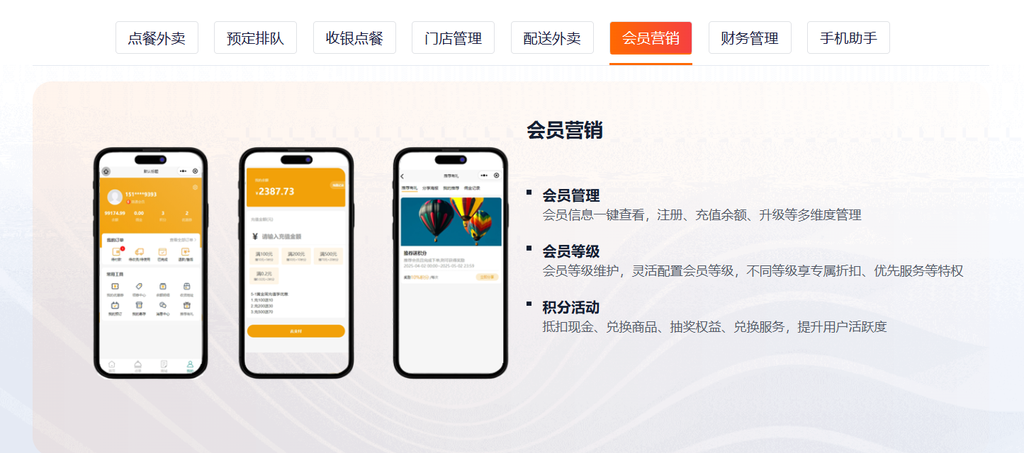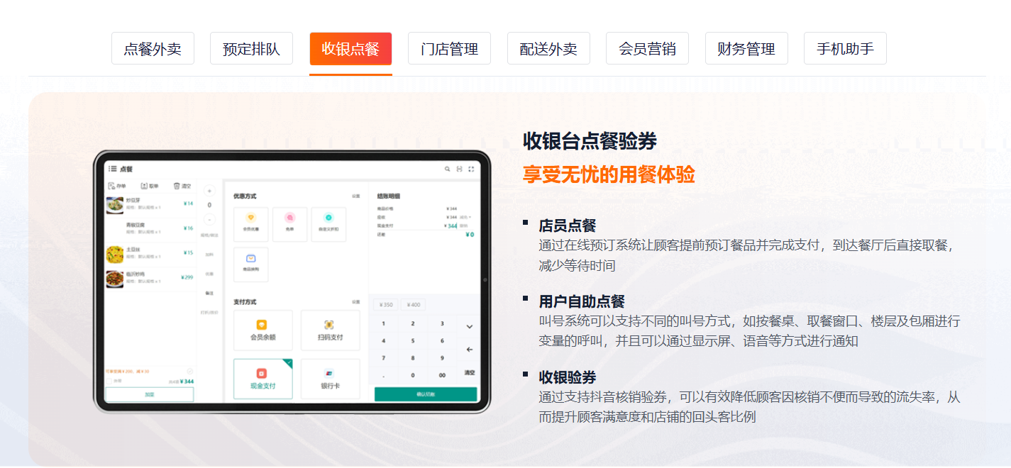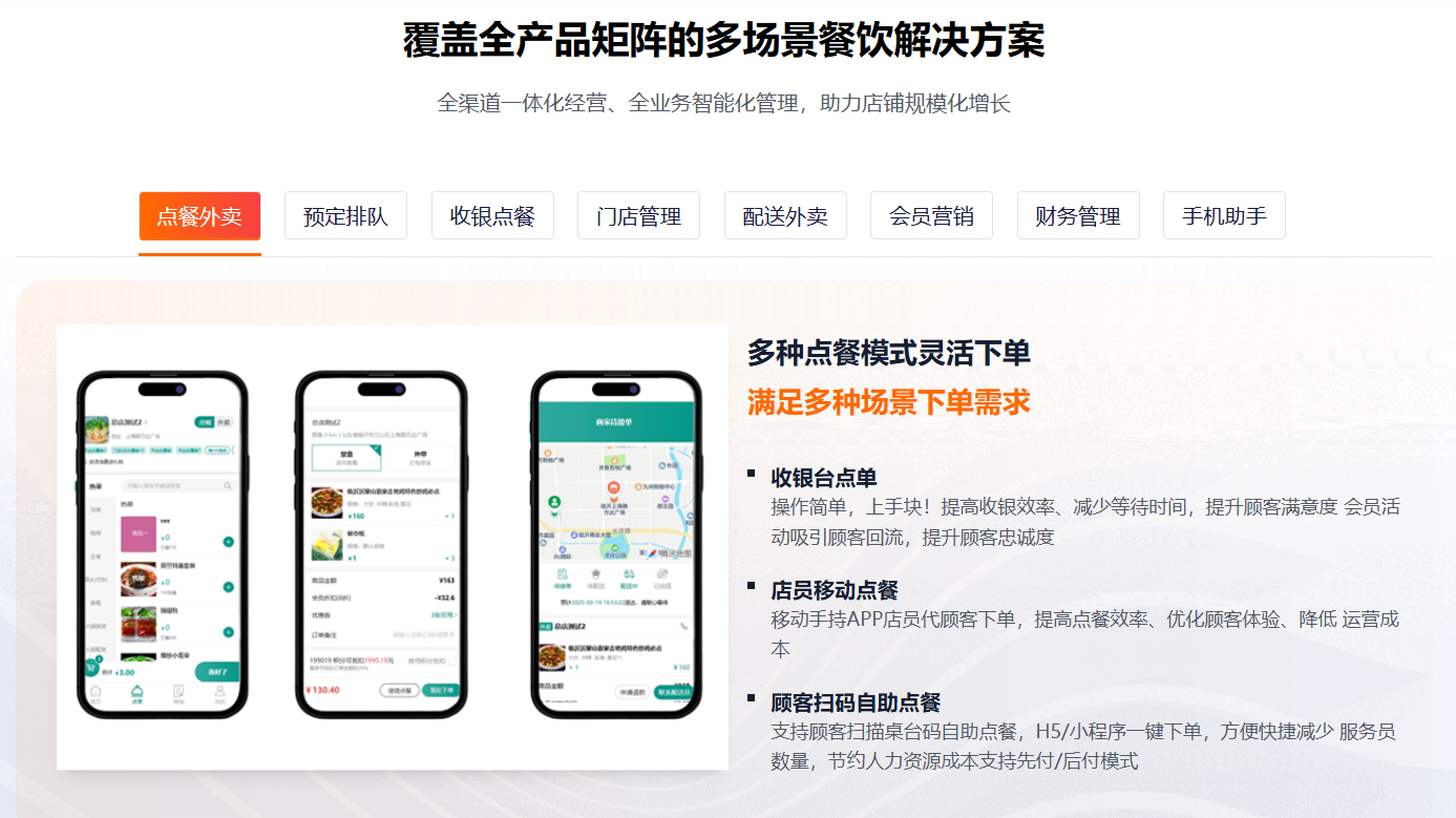 主要功能标签:桌码、外卖、集合配送、收银台、扫码枪、服务员手机点餐、会员营销、存取、财务管理、各种营销功能、优惠券