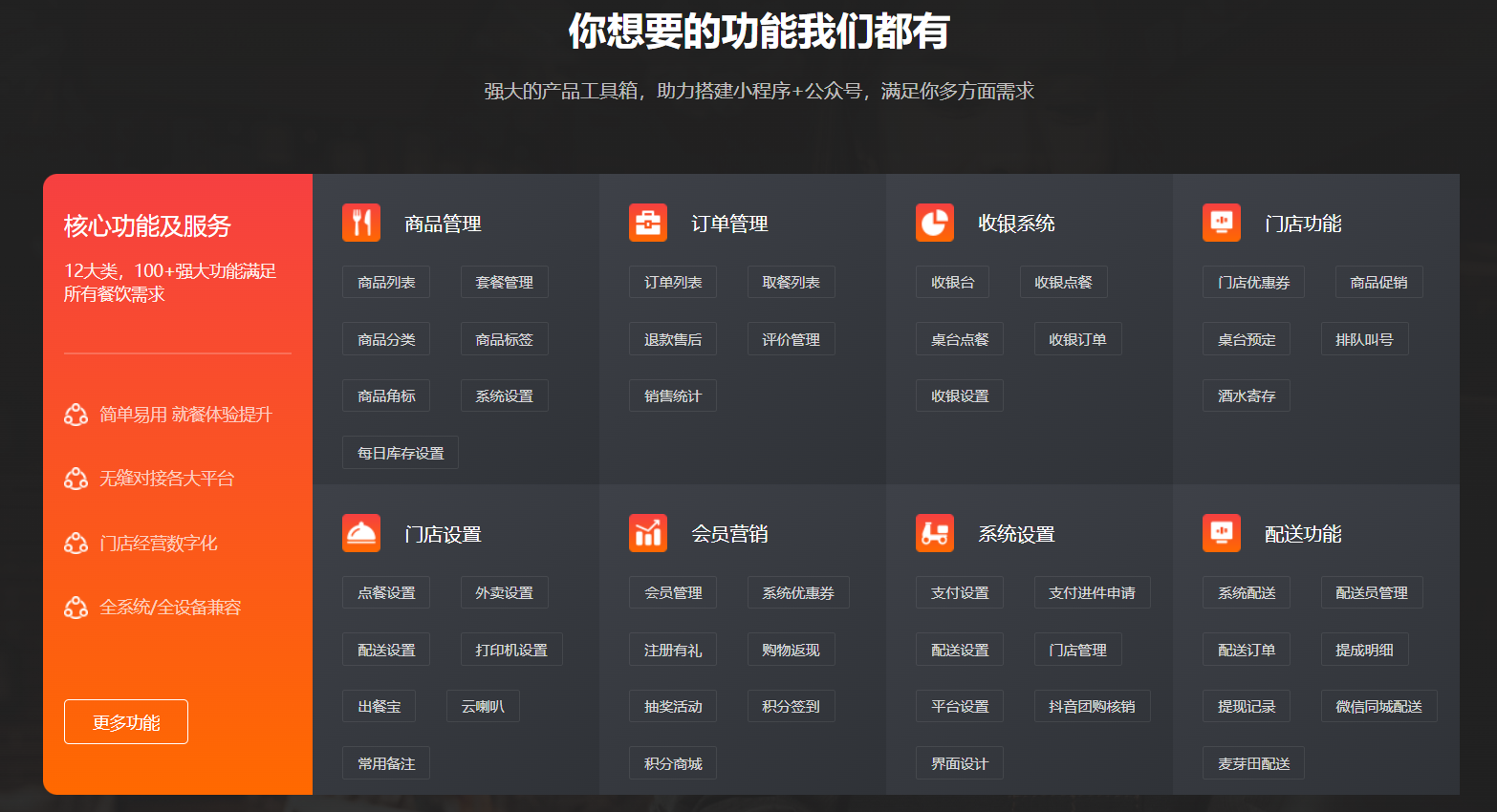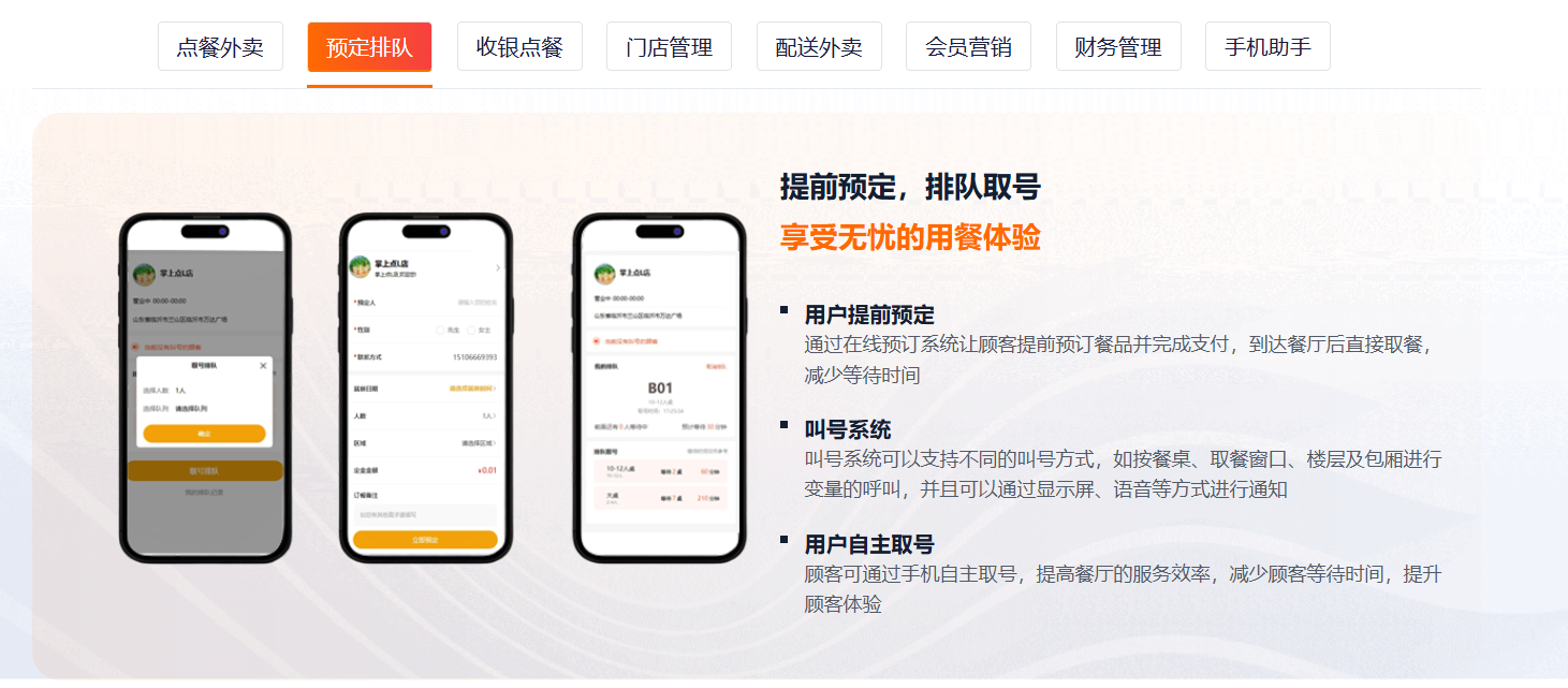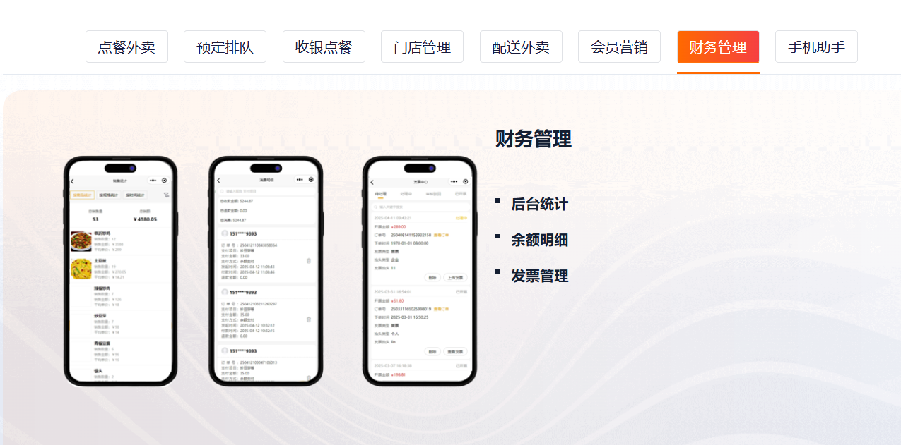 主要功能标签:桌码、外卖、集合配送、收银台、扫码枪、服务员手机点餐、会员营销、存取、财务管理、各种营销功能、优惠券