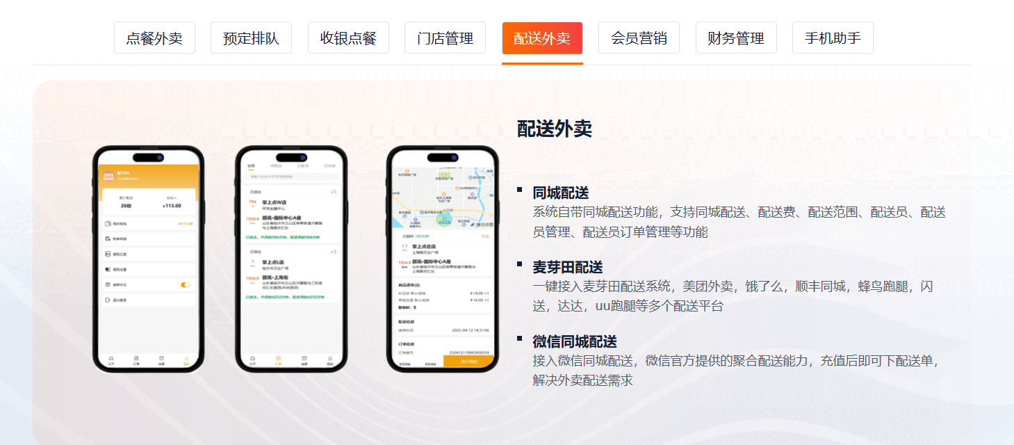 主要功能标签:桌码、外卖、集合配送、收银台、扫码枪、服务员手机点餐、会员营销、存取、财务管理、各种营销功能、优惠券