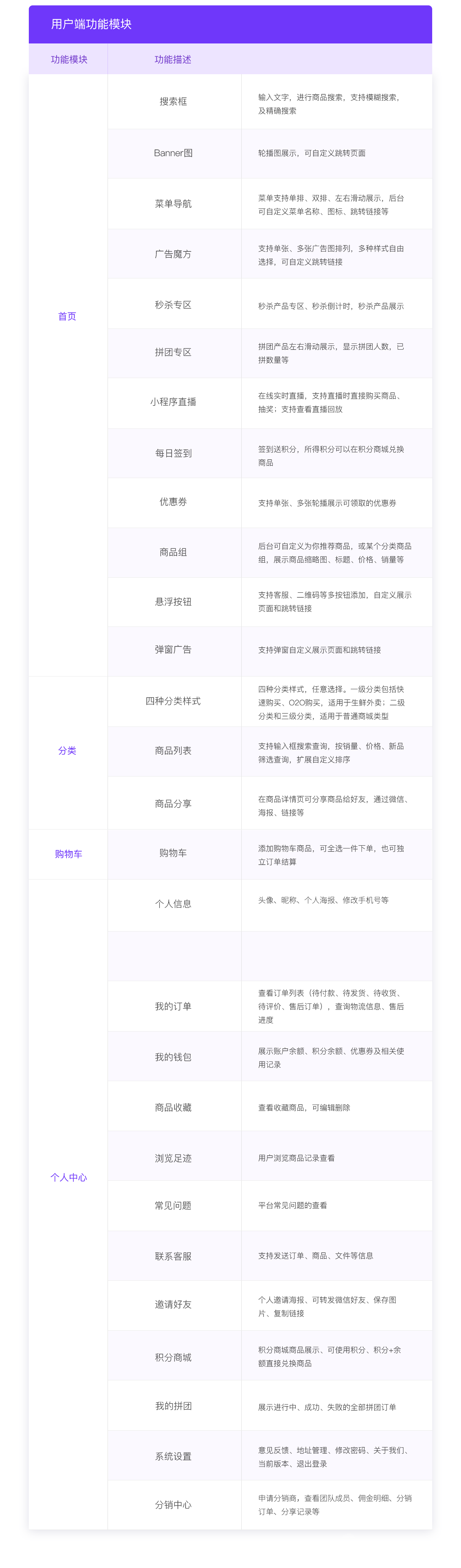 主要功能标签:拼团、秒杀、优惠券、物流、装修、分销